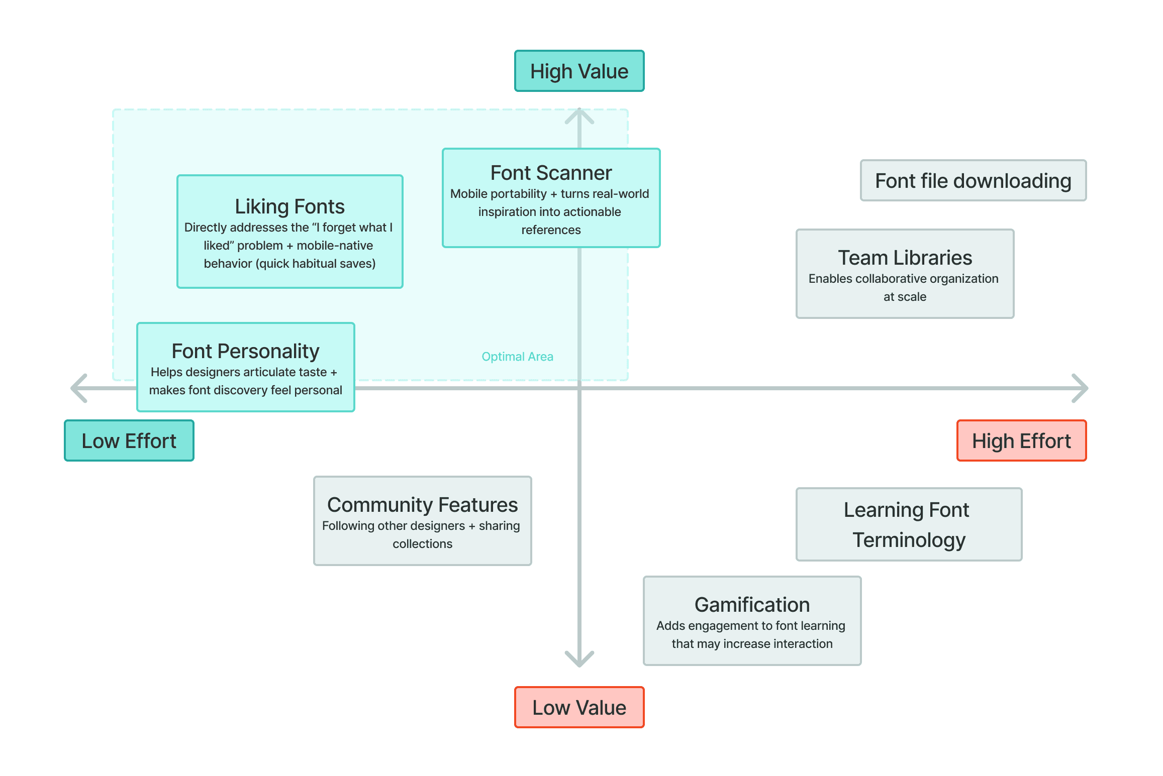 I evaluated common font-browsing features through an effort-value lens. Since my goal was to create a mobile app, I targeted the low-effort & high-value zone that supports habitual, lightweight font discovery.
