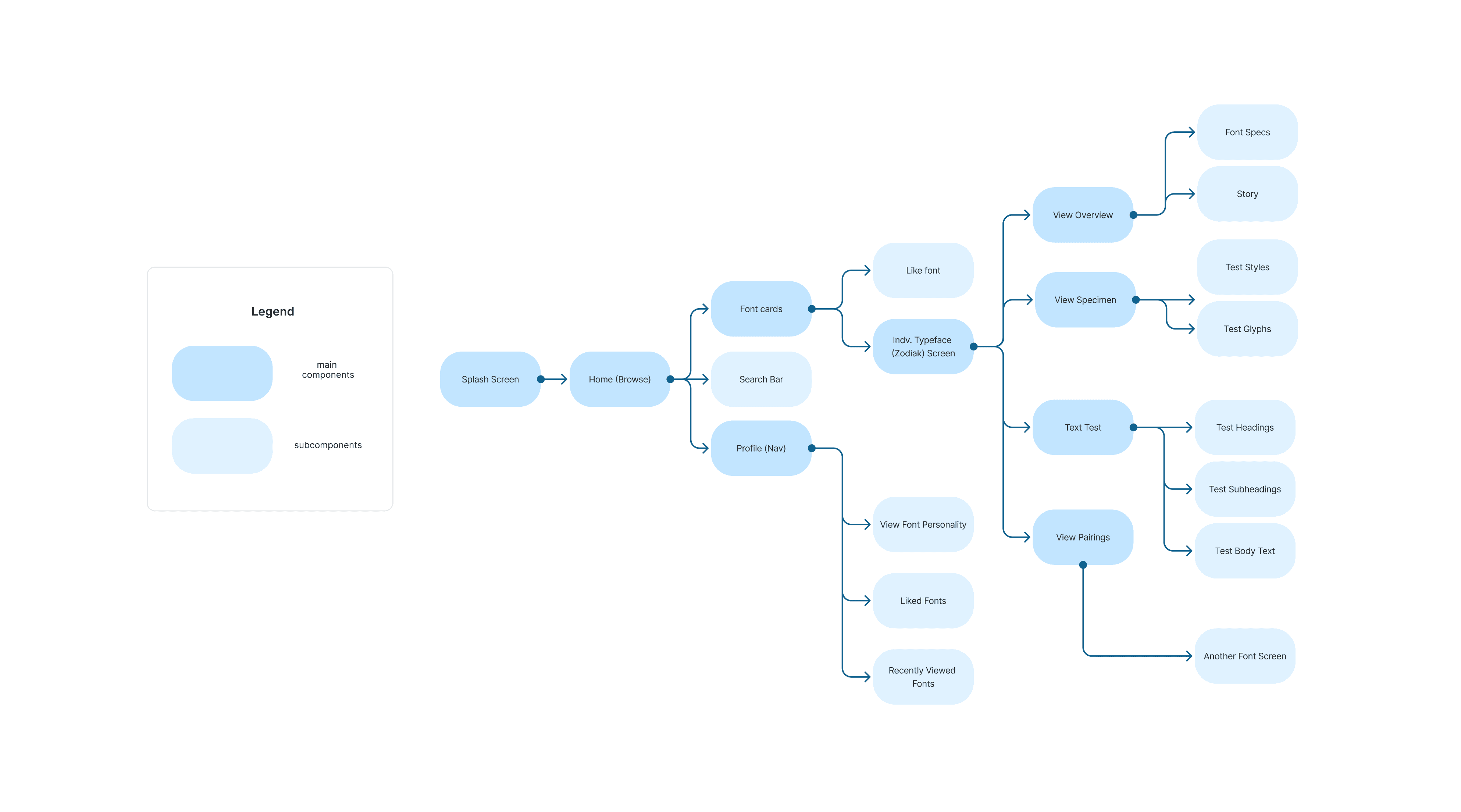Maps the primary paths users take to discover, explore, save, and revisit fonts.