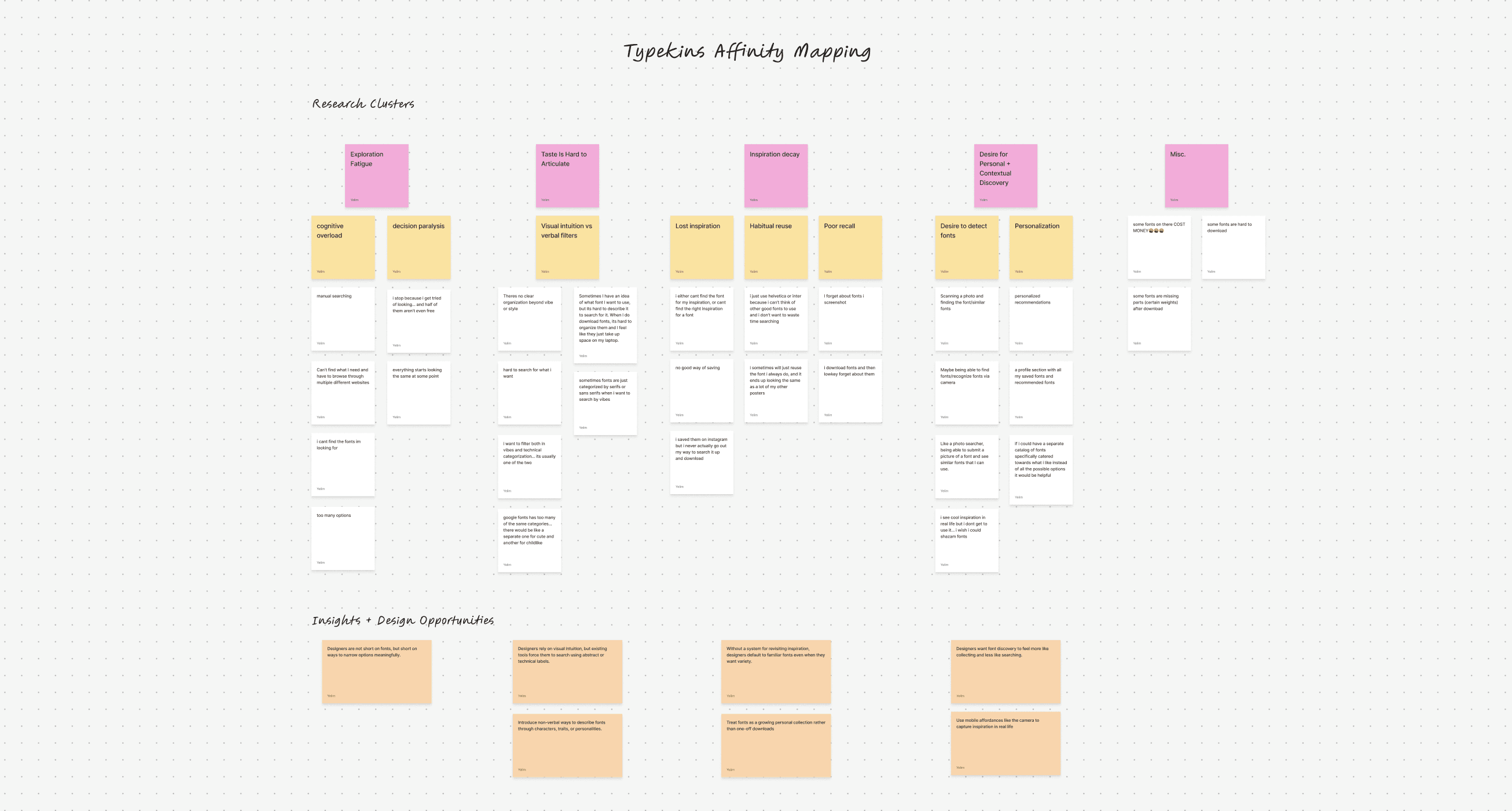 This data is collected among 5 designers of varying expertise, mapped to organize interview insights, revealing common pain points in font discovery, inspiration retention, and personalization.